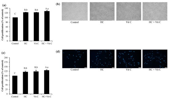 Effect of HC, Vit C, and HC combined with Vit C (HC+Vit C) at the selected levels on the proliferation of HDF cells determined using MTT assay (a) and cell morphology images (b). Double-stranded DNA (dsDNA) assay (c) and DNA staining images (d) after treatment with the different samples. The scale bar is 100 μm, and the magnification used is ×10. Bars represent standard deviation (n = 3). Different uppercase letters on bars indicate significant differences between different samples tested and control (p < 0.05). Different lowercase letters on bars indicate significant differences among different samples tested (p < 0.05).