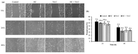 The impact of HC, Vit C, and HC+Vit C at the selected level on cell migration is illustrated in Figure 4. Within the first 24 h of treatment, the efficacy of HC-treated cells and Vit C-treated cells was similar to the control (p > 0.05) (Figure 4a,b). Nevertheless, the increased efficacy of cell migration was found for cells treated with HC+Vit C, as evidenced by the decreased area of the wound compared to other treatments (p < 0.05). It indicated that HC+Vit C had an excellent ability to heal the wound, in which the wound gap was reduced by 55.68%, compared with that of 0 h (Figure 4b). With the extended incubation time (48 h), a decrease in wound gap was observed for all samples. Moreover, three samples (HC, Vit C, and HC+Vit C) had higher efficacy of wound healing than the control (p < 0.05). Nonetheless, the efficacy of wound healing among the three samples was not different (p > 0.05) (Figure 4a,b), and the wound gap was reduced to 34.08%–35.90% as compared to that of 0 h.
