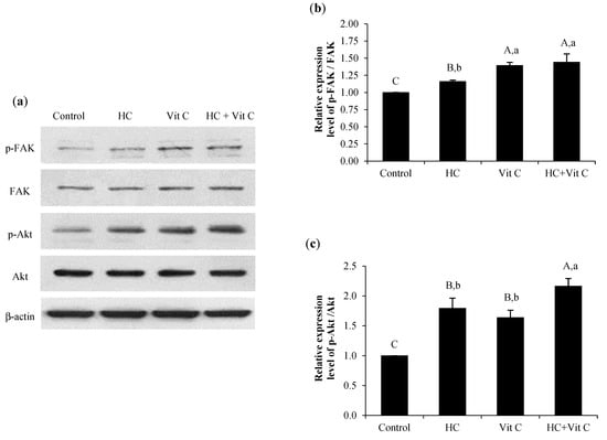 The expression levels of phosphorylated FAK (p-FAK) and Akt (p-Akt) of different samples are shown in Figure 6. All samples tested had higher levels of p-FAK than the control (p < 0.05). When comparing all the samples tested, a higher level of p-FAK was found in HC+Vit C and Vit C samples (p < 0.05) (Figure 6a,b). When the expression level of p-Akt among the samples tested was compared (Figure 6a,c), a marked increase in p-Akt level was found for the HC+Vit C sample (p < 0.05) (Figure 6c), while HC and Vit C samples showed similar p-Akt level (p > 0.05) (Figure 6c).