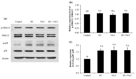 Effect of HC, Vit C, and HC combined with Vit C (HC+Vit C) at the selected levels on the expression of p-ERK1/2 and p-p38 proteins (a) and relative level of p-ERK1/2 (b) and p-p38 (c) in HDF cells after treatment with the samples for 24 h. Bars represent standard deviation (n = 3). Different uppercase letters on bars indicate significant differences between different samples tested and control (p < 0.05). Different lowercase letters on bars indicate significant differences among different samples tested (p < 0.05).