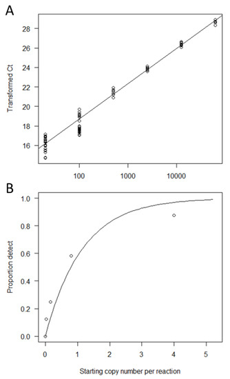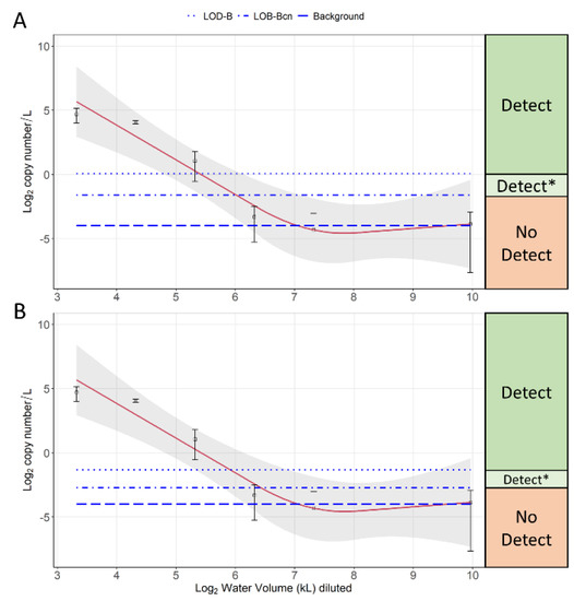 - Lesperance, M.L.; Allison, M.J.; Bergman, L.C.; Hocking, M.D.; Helbing, C.C. A statistical model for calibration and computation of detection and quantification limits for low copy number environmental DNA samples. Environ. DNA 2021, 3, 970–981. [Google Scholar] [CrossRef]