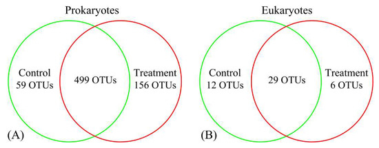 Venn diagrams showing the numbers of OTUs shared between the control and treatment groups for the prokaryotic (A) and eukaryotic (B) communities, respectively. Green cycles represent the control group and red cycles represent the treatment group.