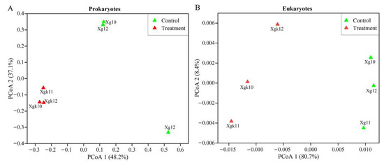 PCoA analysis was used to compare the larval microbial communities between treatment and control groups at the OTU level. As shown in Figure 2, generally, samples of the same group were clustered together, suggesting that the bacterial and eukaryotic microbial communities of the treatment group were clearly distinct from those of the control group.