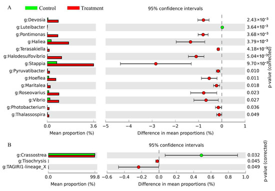 We further explored the responses of larval microbiome compositions at the finer genus level to antibiotics. As shown in Figure 4, most of the dominant microbial taxa exhibited remarkably higher abundance in the treatment group in comparison with the control group (p < 0.05). The relative abundances of Vibrio, Devosia, Pontimonas, Haliea, Terasakiella, Halodesulfovibrio, Stappia, Hoeflea, Maritalea, Roseovarius, Photobacterium, Thalassospira and Pyruvatibacter were significantly enriched, while that of Luteibacter was significantly underrepresented in the treatment group compared with the control group (Figure 4A). Significant differences were also detected in the relative abundances of Crassostrea, Tisochrysis and TAGIRI1-lineage_X when comparing the genus-level eukaryotic microbiota between treatment and control groups (Figure 4B). Notably, the relative abundances of Tisochrysis and TAGIRI1-lineage_X were dramatically higher, while that of Crassostrea was significantly lower in the treatment group compared with the control group (Figure 4B).