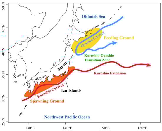 - Sogawa, S.; Hidaka, K.; Kamimura, Y.; Takahashi, M.; Saito, H.; Okazaki, Y.; Shimizu, Y.; Setou, T. Environmental characteristics of spawning and nursery grounds of Japanese sardine and mackerels in the Kuroshio and Kuroshio Extension area. Fish. Oceanogr. 2019, 28, 454–467. [Google Scholar] [CrossRef]