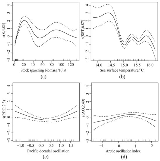 | GAM4 | ln(R/S) ~ s(S) + s(SST) + s(PDO) + s(AO) | 58.6 | *** | 0.91 | 95.70% | 57.9 | 86.7 | |