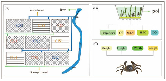 Aquatic products are rich in protein, eicosapentaenoic acid (EPA) and docosahexaenoic acid (DHA), which are indispensable nutrition for human brain development, intelligence development, improvement of human immune function and health quality source [1]. In recent years, aquaculture had developed rapidly, and artificial aquaculture accounted for more than half of the world’s aquatic products [2]. China is the largest aquaculture country in the world, with rich fishery resources and a long history of aquaculture [3]. In 2019, the total amount of aquatic products in China was 64.8 million tons, and the ratio of aquaculture output to fishing output was 78.4:21.6 [4]. Chinese mitten crab (Eriocheir sinensis) is an important aquatic product, and many Asian countries have a tradition of eating hairy crabs, especially in China, although the animals may pose a risk of biological invasion in Europe and America. There are records indicating the raising and feeding Chinese mitten crabs in China as early as 1844 [5]. In recent years, Chinese mitten crab culture has developed rapidly. Generally speaking, Chinese mitten crabs would be cultured for two years until they were put on the market [6]. In the first year, juvenile crabs are cultivated to a button size and then to a marketable size with sexual maturity in the next year [7]. After putting the juvenile crabs into the water, germplasm and specification are determined. The growth environment is particularly important. Cage culture and pond culture are the two main methods of crab culture at present. In the wild water, cage culture are employed and crabs are usually stocked at low density because of no supplementary feed, which limited the accurate control of the breeding environment [8,9]. At the same time, cage breeding in wild water would also pollute the water and cause eutrophication [10]. In order to further protect the water environment and increase production, the pond culture of crabs is constantly replacing cage culture in the wild. Consequently, since 2006, pond culture has dominated crab farming, not only in terms of breeding areas, but also in terms of output. Pond farming is also constantly transitioning to ecological farming in order to provide people with more ecologically healthy aquatic products.