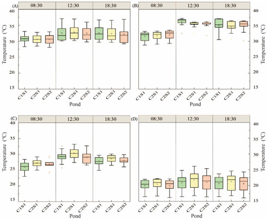 Monthly variation of water temperature in different ponds. (A) July; (B) August; (C) September; (D) October.