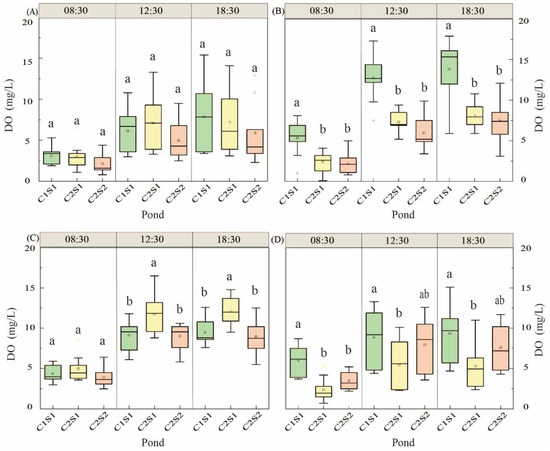 For the three aquaculture ponds with different treatments, due to the consumption of one night, the DO content in the morning (8:30) was lower than that at noon (12:30 p.m.) and evening (6:30 p.m.) during the experiment period (Figure 3). However, in different months, the DO content in different ponds had different changing rules. In July, the DO content of the three treatment ponds was at a relatively low level, and there was no significant difference in the DO content among the three ponds (p > 0.05, Figure 3A). In August and October, the DO content of C1S1 was significantly higher than that of the other two ponds (p < 0.05), but there was no significant difference between C2S1 and C2S2 (Figure 3B,D). In September, although there was no significant difference in the DO content of the three ponds in the morning (p > 0.05), the DO content of C2S1 at noon and evening was significantly higher than that of C1S1 and C2S2 (p < 0.05, Figure 3C).