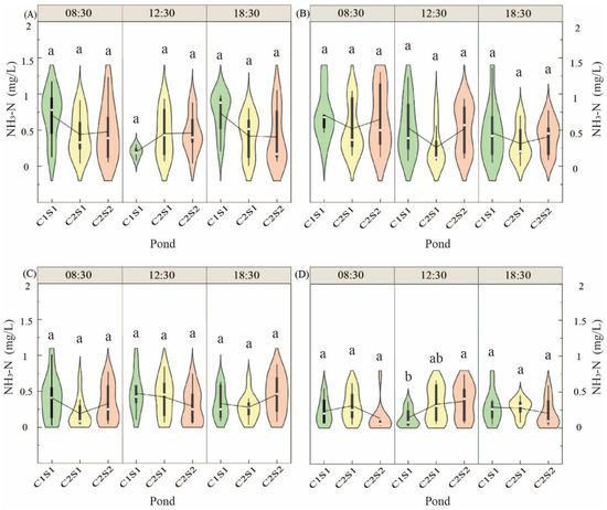 Monthly variation of water ammonium-nitrogen (NH3-N) in different ponds. (A) July; (B) August; (C) September; (D) October. Values with the same letter are not significantly different (LSD post hoc test).