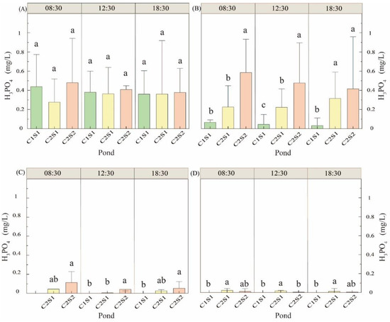 From July to October, the content of H3PO4 in water changed significantly (Figure 5). In July, the H3PO4 content of the three treatment ponds was maintained at a high level, and there was no significant difference (p > 0.05, Figure 5A). In August, the H3PO4 content of C2S2 remained at a high level, followed by C2S1, and the H3PO4 content of C1S1 was the lowest (Figure 5B). The H3PO4 concentration of C2S2 was significantly higher than that of C1S1 (Figure 5B). In September, the rules of H3PO4 content in the three ponds with different treatments was the same as that in August, but the H3PO4 content of each pond was significantly lower than that in August (Figure 5C). In October, the H3PO4 concentration of three ponds further decreased, and the H3PO4 content of C2S1 was significantly higher than that of the other two ponds (p < 0.05, Figure 5D).