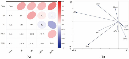 The correlation analysis showed that NH3-N and pH were significantly positively correlated (p < 0.05, Figure 6A). At the same time, there was a significant negative correlation between NH3-N and DO (p < 0.05), H3PO4 and pH (p < 0.05). Further analysis of the relationship between surface area, waterweed coverage and environmental factors revealed that the surface area and waterweed coverage were closely related to NH3-N, H3PO4 and DO, but not to pH and temperature (Figure 6B).