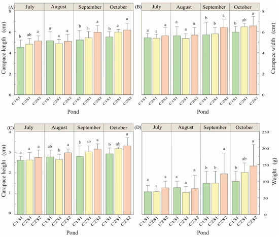 Increment dynamic of growth-related traits of E. sinensis in different ponds. (A) Carapace length; (B) Carapace width; (C) Carapace height; (D) Weight. Values with the same letter are not significantly different (LSD post hoc test).