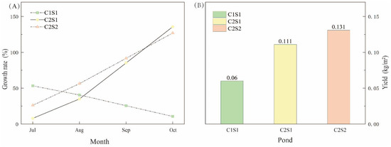 In the final stage of the experiment, the yields of different ponds were also counted (Figure 8B). In comparison with the three ponds, C2S2 had the highest yield, reaching 0.1311 kg/m2, which was more than twice that of C1S1. The yields of the C2S1 and C1S1 reached 0.1111 kg/m2 and 0.0600 kg/m2, respectively.