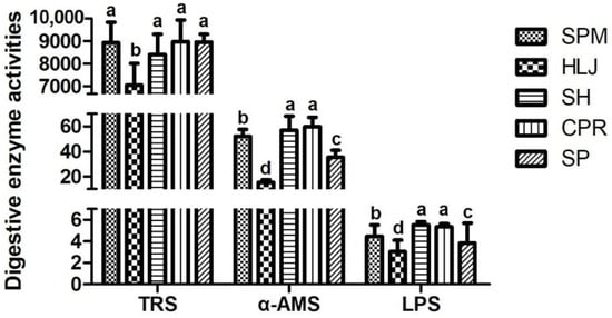 p < 0.05), and MDA was relatively low, so it is speculated that the liver’s antioxidant capacity was strongest in HLJ. In contrast, the activities of the LPS, TRS, and α-AMS intestinal digestive enzymes in HLJ were significantly lower than those in the other common carp species (