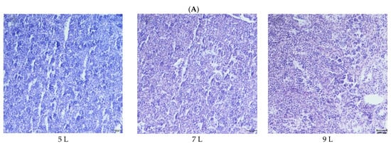 Considering O. macrolepis males, different dietary lipid levels only affected GSIm and SSI values (p < 0.05; Table 5). In particular, the highest and lowest GSIm values were found in fish fed 9 L (1.33 ± 1.66%) and 7 L (0.67 ± 0.19%) diets, respectively (p < 0.05; Table 5), whereas the rest of the dietary groups showed intermediate values. Regarding the SSI, the highest values were found in males fed 9 L (0.25 ± 0.08%) and 11 L (0.23 ± 0.06%) diets, whereas the lowest SSI values were recorded in males fed 5 L (0.18 ± 0.03%) and 7 L (0.17 ± 0.05%) diets (p < 0.05). The rest of the somatic indexes evaluated in males (HSI, VSI, PVFI, RSI, and RILBL) were not significantly different among dietary groups (p > 0.05; Table 5).