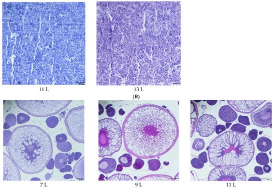 Histological section of the testis and ovary of the male and female O. macrolepis broodstock, fed graded lipid levels during 8 weeks of feeding trial. (Testis, 100× magnification; ovary, 40× magnification; bar = 100 µm). Here only show histological section of the ovary in 7 L, 9 L and 11 L groups. (A). Gonad of male (testis); (B). Gonad of female (overy).