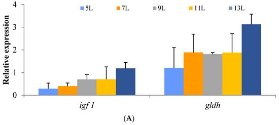 The relative expression of genes involved in growth and protein metabolism in the hepatopancreas of O. macrolepis fed diets with different lipid levels are illustrated in Figure 2A. In particular, relative gene expression values for igf and gldh were similar among other experimental groups (Figure 2A).