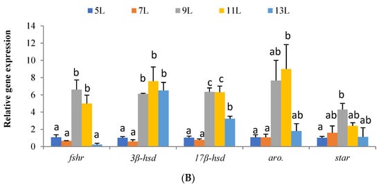 By feeding experiment, the present investigation studied the effect of lipid levels in feed on fish steroid hormone synthesis, including the critical process of steroid hormone synthesis (i.e., response to gonadotropin (fshr), cholesterol transport (star.), and enzymatic reaction process (3β-hsd, 17β-hsd, aro.), respectively, by molecular biological methods, to reveal the relevant mechanism and process of LL regulating steroid hormone synthesis. These fundamental processes are the core processes of steroid hormone synthesis, but there are few studies on their regulation by feed nutrients [66]. The present results showed that most of these genes were highly expressed in groups 9 L and 11 L (Figure 2), indicating that proper dietary lipid level is suitable for steroidogenesis and gonad maturation for O. macrolepis broodfish.