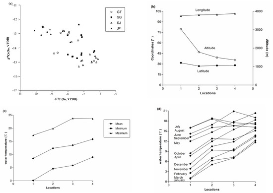 Stable isotope ratios, geographical location and ambient water temperature of wild Schizothorax kozlovi in each sampling location (1—location GT, 2—location SG, 3—location SJ, 4—location JP). (a) δ18O and δ13C variation; (b) coordinates and altitude; (c) mean, minimum and maximum water temperature; (d) mean monthly water temperature.