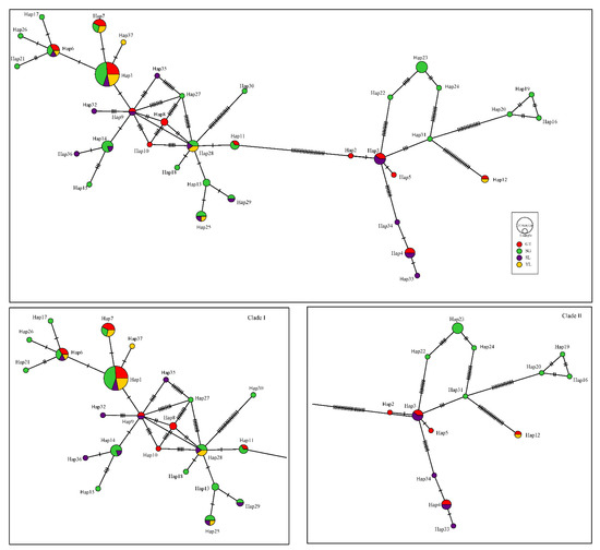 - Bandelt, H.J.; Forster, P.; Röhl, A. Median-joining networks for inferring intraspecific phylogenies. Mol. Biol. Evol. 1999, 16, 37–48. [Google Scholar] [CrossRef]
