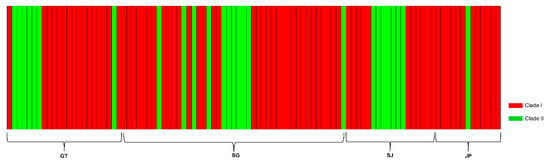 Fragments 683 bp in length encoding the COI gene (GenBank Accession numbers: MW403091-MW403127) and 1141 bp in length encoding the Cytb gene (GenBank Accession numbers: MW401231-MW401267) were obtained from 99 specimens, yielding a total length of 1824 bp of concatenated sequence. For the Cytb gene, variable sites, singleton variable sites, and parsimony-informative sites were 84, 26 and 58, respectively. For the COI gene, variable sites, singleton variable sites, and parsimony-informative sites were 16, 4 and 12, respectively. In total, 37 haplotypes were identified based on the concatenated sequences of Cytb and COI, with the number of haplotypes varying between 7 and 23 among locations. Population SJ exhibited the highest haplotype diversity (0.967 ± 0.030), while population SG exhibited the highest nucleotide diversity (0.00871 ± 0.00124) (Table 3). Population JP presented the lowest haplotype diversity (0.846 ± 0.085) and nucleotide diversity (0.00361 ± 0.00199) (Table 3).