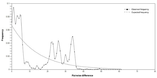 Observed and expected distributions of pair-wise sequence differences in mitochondrial concatenated sequences of Cytb and COI of Schizothorax kozlovi in the upper Yangtze River.