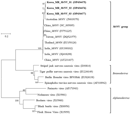 The phylogenetic analysis demonstrated that the capsid protein gene sequences of MrNV obtained in this study and the 17 related sequences belonging to the family Nodaviridae formed three groups—MrNV, alphanodavirus, and betanodavirus. The capsid protein gene sequences of MrNV were monophyletic with the MrNV group reported from Australia, China, Taiwan, Thailand, and India. This was distinguished from alphanodavirus and betanodavirus in the family Nodaviridae (Figure 1).