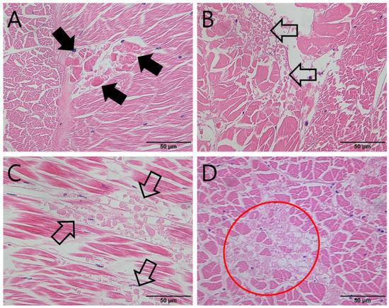 Zenker’s necrosis and myolysis in the abdominal striated muscle of Macrobrachium rosenbergii infected with MrNV (M. rosenbergii nodavirus) with H & E staining. (A) Zenker’s necrosis (black arrows); (B,C) local myolysis (transparent arrows); (D) disseminated myolysis.