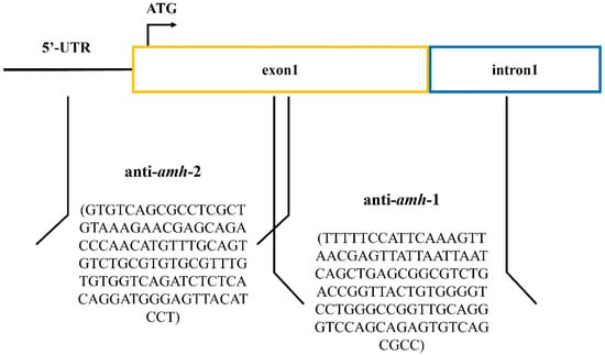 Design and action site of two amh antisense RNA sequences. Interference sites of the two antisense RNAs (anti-amh-1 and anti-amh-2).