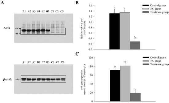 Down-regulation of amh down-regulated the expression of Amh protein and the mRNA expression level of amh. (A) Representative images of expression levels of Amh protein in testis tissues of control and treatment groups: A1–A3, control; B1–B3, negative control (NC); C1–C3, treatment. β-actin was an internal parameter in each group; (B) Transcript levels of amh in testis tissues of each group (mean ± SE, n = 12 replicates). Identification of amh mRNA levels in treatment, control, and negative control (NC) groups as determined by qRT-PCR; (C) Absolute quantitative expression levels of amh in testis tissues of each group (mean ± SE, n = 12 replicates). Identification of amh mRNA levels in treatment, control, and negative control (NC) groups as determined by qRT-PCR. Different lowercase letters indicate significant differences (p < 0.05).