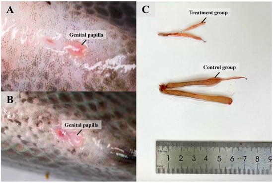 According to the method described by Qiang et al. [], at 60 days of age, 12 male fish were randomly selected from each treatment. The fish were deeply anesthetized (using MS-222 solution, 200 mg/L), and their gonads were dissected. Genomic DNA was extracted using the MiniBEST Universal Genomic DNA Extraction Kit Ver 5.0 (Takara Bio Inc., Shiga, Japan). The 20 µL PCR reaction system comprised 0.5 µL each upstream and downstream primer (F1: TTTTGCGCTGCTTCGCGATGTAC, R1: TCCCAATCCTCCCCCTTGCTG, concentration 10 mmol/µL), 1 µL genomic DNA, 10 µL Premix Taq (LA Taq Version 2.0, Dalian, China), and 8 µL RNase-free water. The reaction program was as follows: 94 °C for 2 min, then 35 cycles (95 °C 30 s, 50 °C 30 s, 72 °C 2 min), and a final cycle at 72 °C for 5 min.