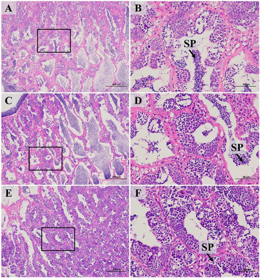 Representative sections of testis tissues from male Nile tilapia with knocked-down amh in: (A) control group at 100× and (B) 400×; (C) negative control group at 100× and (D) 400×; and (E) treatment group at 100× and (F) 400×. SP: sperm.