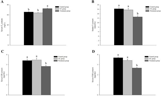 Serum E2 levels in the treatment group were significantly higher than in the control and NC groups (p < 0.05). Contrarily, the levels of T, LH, and FSH were significantly lower than those of the control and NC groups (p < 0.05) (Figure 5).