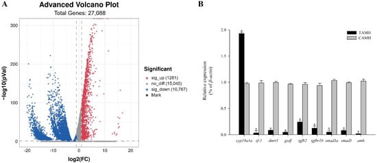 (A) Volcano plot of differentially expressed genes (DEGs) in Nile tilapia under knocked-down amh (treatment groups vs. control groups). Dots: blue, down-regulated DEGs in treatment compared with control groups; red, up-regulated DEGs in treatment compared with control groups; gray, genes with no significant difference in expression. (B) Transcript levels of differentially expressed genes (DEGs) in males based on qRT-PCR analyses (n = 9 replicates per group). Nine DEGs were selected for qRT-PCR verification. Asterisk (*) indicates significant difference (p < 0.05) between TAMH and CAMH.