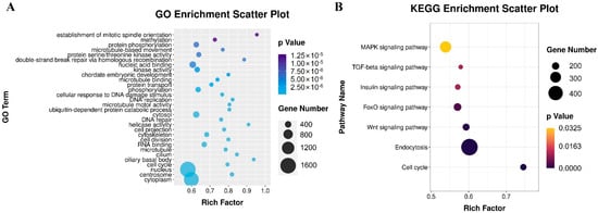 The functional classification and enrichment pathways of selected DEGs were analyzed using tools from the GO and KEGG databases. Because of the large number of DEGs, we set the change threshold to p < 0.01. Compared with control groups, DEGs in the treatment groups were significantly enriched in 142 GO items, including 51 biological process, 39 cellular component, and 41 molecular function items. The top three significantly enriched items in biological processes were cell cycle, cell division, and DNA repair; in cellular components, cytoplasm, centrosome, and nucleus; and in molecular function, DNA binding, helicase activity, and microtubule motor activity (Figure 7A). The results indicated that knocked-down amh significantly affected the cell metabolism and testis development. KEGG pathways related to the development of primordial gonad cells were studied, with seven significantly enriched signal pathways selected: TGF-beta signaling pathway, cell cycle, endocytosis, Wnt signaling pathway, FoxO signaling pathway, Insulin signaling pathway, and MAPK signaling pathway (Figure 7B).