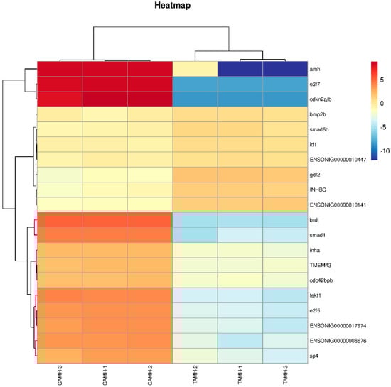 Abnormal TGF-beta signaling pathway caused by knocked-down amh in Nile tilapia. Heat map of the top 20 differentially expressed genes (DEGs) identified in the TGF-beta signaling pathway. DEGs are defined when the |log2 fold change| ≥ 1 and p < 0.05. Colors are scaled per row. Each square indicates the level of gene expression from highest (red) to lowest (blue).