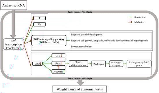 Schematic diagram of down-regulated amh male Nile tilapia testis development and weight gain regulation.