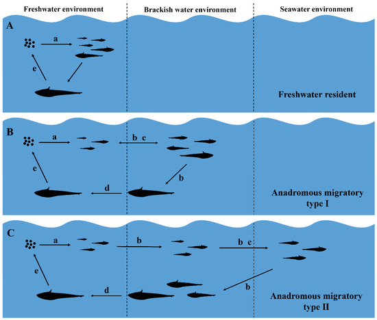 - Dou, S.Z.; Yokouchi, K.; Yu, X.; Cao, L.; Kuroki, M.; Otake, T.; Tsukamotoet, K. The migratory history of anadromous and non-anadromous tapertail anchovy Coilia nasus in the Yangtze River Estuary revealed by the otolith Sr:Ca ratio. Environ. Bio. Fish. 2012, 95, 481–490. [Google Scholar] [CrossRef]