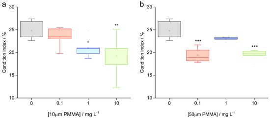 The CI of the control mussels (CON) and mussels exposed to 0.1 mg L−1 (LOW), 1.0 mg L−1 (MID) and 10 mg L−1 (HIGH) PMMA microparticles of (a) 10 µm diameter and (b) 50 µm diameter. The boxes indicate the 2nd and 3rd quartiles, with the median value shown, and the whiskers denote the non-outlier ranges. The open circles indicate the outliers. Statistical significance is indicated at the levels * p < 0.05, ** p < 0.01, *** p < 0.001.
