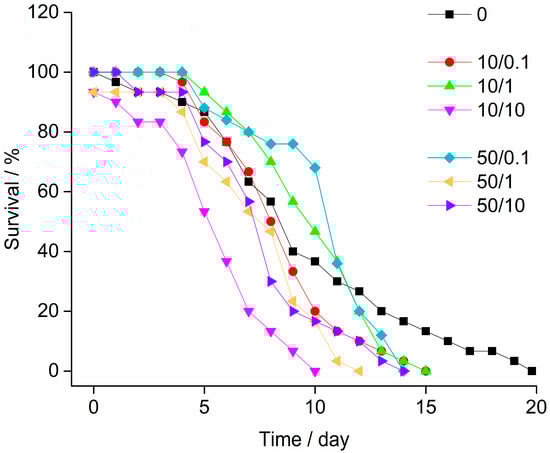 The times of survival of mussels in the air, which represent an additional stress after 72 h of exposure to 10 µm and 50 µm PMMA microparticles, over three weeks are shown in Figure 2. The mussels treated with lower concentrations of microplastics of both sizes showed LT50 values similar to the control LT50 of 8.32 days (Table 1). The lowest survival over time, and hence the most rapid mortality, was noted for mussels exposed to a concentration of 10 mg L−1 (HIGH) of 10 µm PMMA. After ten days, all the mussels were dead, with a calculated LT50 value of 4.35 days. The greatest negative effect was also noted for the 1 (MID) and 10 mg L−1 (HIGH) concentrations of 50 μm microparticles, where very similar LT50 values of about 6.5 days were determined.
