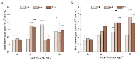 Considering the individual systems in the organism, haemocytes are macrophages that play a key role in the immune system, contributing to a defence against parasites, pathogens, and pollutants [], and provide a convenient way to assess the stressors of the immune system []. While cell viability is typically the most used metric [], other endpoints such as haemocyte vacuolation, expressed in the form of multi-nucleated haemocytes, micronuclei, and binucleated cells, and the deformation of the nucleus such as blebbing, provide a large number of assessment criteria for assessing perturbations in the mussel immune system [,]. As haemocytes circulate in the haemolymph throughout the animal and the major organs, any microparticles associated with the haemocytes or in the haemolymph may achieve a widespread distribution in the organism. Studies have shown the uptake of polystyrene particles (3.0 μm and 9.6 µm) in the haemolymph and haemocytes of Mytilus edulis after three days, with the smaller particles observed in significantly higher amounts compared to the larger microspheres []. Interestingly, the particles were still detected in the haemolymph after 48 days. A similar study on microplastics which exposed M. galloprovincialis to 3 μm and 45 µm polystyrene microparticles for four days at 1 and 10 particles mL−1 confirmed that even at these low concentrations polystyrene particles could be detected in the haemolymph of all treated mussels []. The present study showed that different sizes of PMMA microparticles could also enter the haemolymph, hence indicating that chemical identity might not be a key factor in microplastic uptake. In addition, it was observed that the lowest concentration of PMMA microparticles induced a significant increase in the number of haemocytes relative to the control group after 48 h (10 μm) and 72 h (50 μm), while at higher concentrations the THC had already started to significantly increase within the first 24 h. This immune response against the presence of 10 μm and 50 μm PMMA microparticles not only shows the activation of a highly sensitive defence mechanism, but also indicates that these microplastics are identified as a threat to the organism. Our study confirms that exposure to MPs induced a significant increase in haemocyte formation, thus these increases are correlated with the concentration of PMMA particles over the time of exposure.