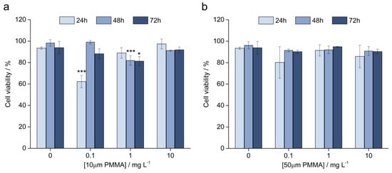 Cell viability (mean ± SD) after 24, 48, and 72 h for control mussels (CON) and mussels exposed to 0.1 mg L−1 (LOW), 1.0 mg L−1 (MID), and 10 mg L−1 (HIGH) PMMA microparticles of (a) 10 µm diameter and (b) 50 µm diameter. Statistical significance is indicated at the levels * p < 0.05, *** p < 0.001.