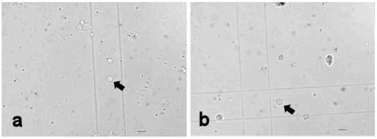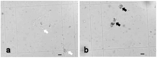Micrographs of the haemolymph of mussels exposed for 48 h to 0.1 mg L−1 PMMA microparticles of diameters (a) 10 µm and (b) 50 µm. Microparticles are indicated by the arrows. Scale bar 20 µm.