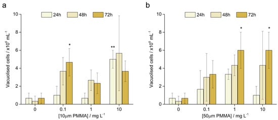 The number of vacuolised cells mL−1 (mean ± SD) after 24, 48, and 72 h for the control mussels (0 mg L−1) and mussels exposed to 0.1 mg L−1 (LOW), 1.0 mg L−1 (MID), and 10 mg L−1 (HIGH) PMMA microparticles of (a) 10 µm diameter and (b) 50 µm diameter. Statistical significance is indicated at the levels * p < 0.05, ** p < 0.01.