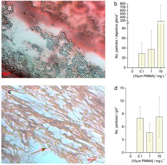 Cryosections of the mussel digestive gland (hepatopancreas) and gills after exposure to PMMA microplastics (10 mg L−1 (HIGH) for 24 h) showed the presence of 10 μm particles, while 50 µm PMMA particles were not observed in the mussel tissue (Figure 8a,c). The particle counts in the tubules of the hepatopancreas showed average values of 25 particles hepatopancreas−1 while a large increase in the number of particles was noted for the 10 mg L−1 (HIGH) microparticle treatment (an average of 300 particles hepatopancreas−1; Figure 8b). The gill tissue cryosections showed far fewer microparticles, with averages of 5–8 particles gill−1 observed, and did not show a trend with respect to increasing the exposure concentrations.