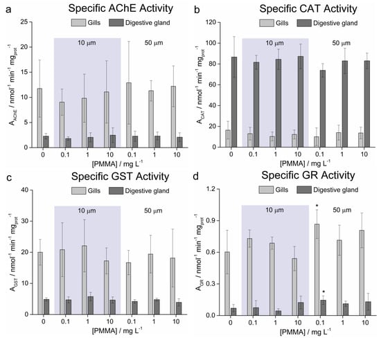 Enzymatic activity in gills and digestive glands after exposure to different sizes (10 and 50 μm)/concentrations (0.1, 1, 10 mg L−1) of PMMA microparticles: (a) acetylcholinesterase (AChE), (b) catalase (CAT), (c) glutathione-S-transferase (GST), and (d) glutathione reductase (GR). Statistical significance is indicated at the level * p < 0.05.