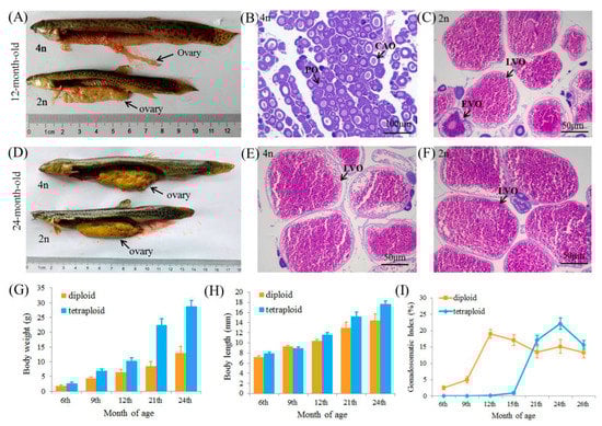 The morphological difference (Figure 1A,D) and histological features (Figure 1B,C,E,F) of the ovary in diploids and tetraploids were investigated, respectively. Tetraploid individuals exhibit superior growth performance, especially for body weight (BWs), than diploids in all stages (Figure 1G,H). At 12 and 24 months old, the BWs of tetraploids were 1.3- and 2.63-fold higher than those of diploids, respectively.