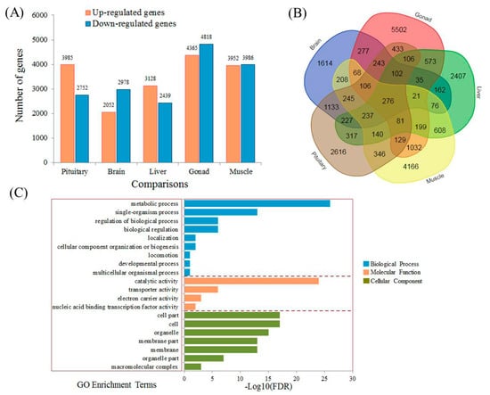 Differentially expressed genes (DEGs) obtained by pairwise compassion in five tissues of M. anguillicaudatus. (A) The number of identified DEGs in each tissue; (B) the five-way Venn diagram of the DEGs identified from the five tissues; (C) DEGs overlapped among tissues.