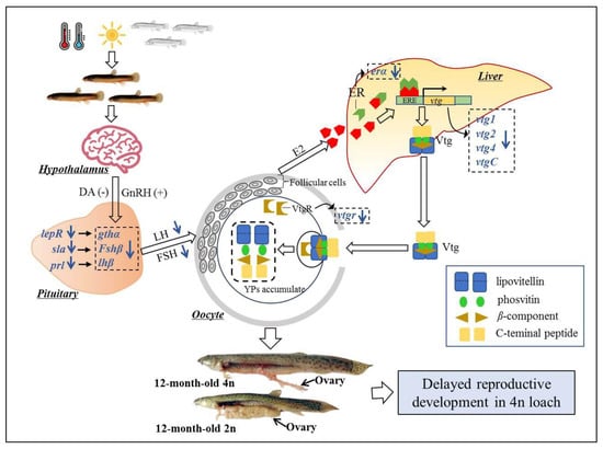 Gonadal development and maturation of fish are primarily controlled by the endocrine system consisting of the hypothalamus–pituitary–gonad (HPG) axis. Some key DEGs related to Jak-STAT signaling pathway, cytokine–cytokine receptor interaction, ECM–receptor interaction and cell adhesion molecules were detected. Notably, the lower expression levels of cyp19a1b (brain aromatase) and erβ1 (estrogen receptor beta1) in the brain were decreased in tetraploids. In the pituitaries, the major hormones of reproduction, i.e., gthα, lhβ and fshβ, which directly control many aspects of gonadal development and function, exhibited a decreased expression pattern in tetraploids. In addition, the secondary hormones of reproduction, such as gh and prl (prolactin), were also decreased in tetraploid individuals. In contrast, the reproduction-inhibiting genes, such as D(2)-like dopamine receptors and gabar (γ-aminobutyric acid receptor), were up-regulated in tetraploid individuals. In the gonad, for genes related to reproductive and gonadal development, cystatin, cystatin-B and cyp19a1a (gonadal aromatase) were up-regulated, whereas the vtgR (vitellogenin receptor) were down-regulated. It was proposed that gonad GH/IGF-I axis also plays important roles in regulating the reproduction in teleosts, we found a lower expression of ghr (growth hormone receptor), igf1r (Insulin-like growth factor 1 receptor), igf2, igfBP2b (IGF-binding protein 2b), igfBP3 and igf2BP1 (IGF2 mRNA-binding protein 1) in the tetraploid gonads. In addition to the HPG axis, we found that the hepatic expression levels of erβ1 (estrogen receptor bata1), vtg1 (vitellogenin 1), vtg2 (vitellogenin 2), vtgC (vitellogenin C), vtg4 (vitellogenin 4), fabp2 (fatty acid desaturase 2), fabp10 (fatty acid-binding protein 10) and leptin were significantly lower in tetraploids compared with diploids. The delayed ovarian development of tetraploid M. anguillicaudatus also illustrated from the perspective of vitellogenesis pathway, as shown in Figure 3.